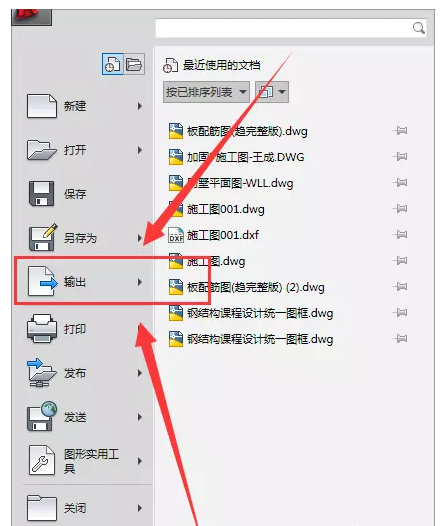 点击软件左上角的CAD图标,弹出菜单栏,然后在菜单栏中找到并点击【输出】选项,