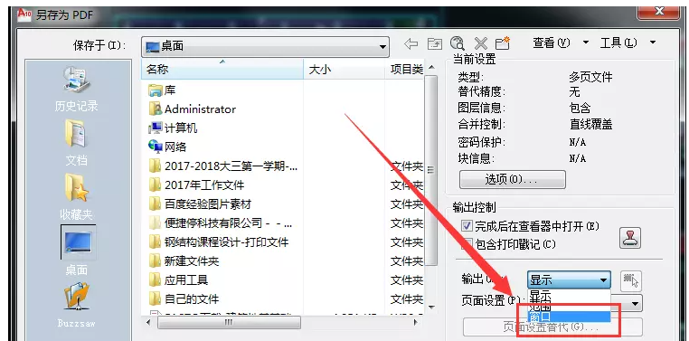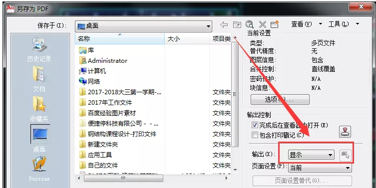 此时会弹出【另存为PDF】对话框,如图,现在选择需要输出的图形,点击右下方的【输出】——【显示】,
