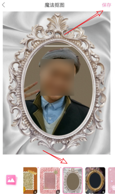 小编选择了一个复古镜子的背景,然后缩放图片,将其移动至合适位置,最后点击右上角的【保存】,即可导出保存抠图之后的照片。