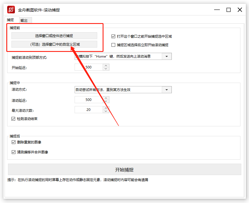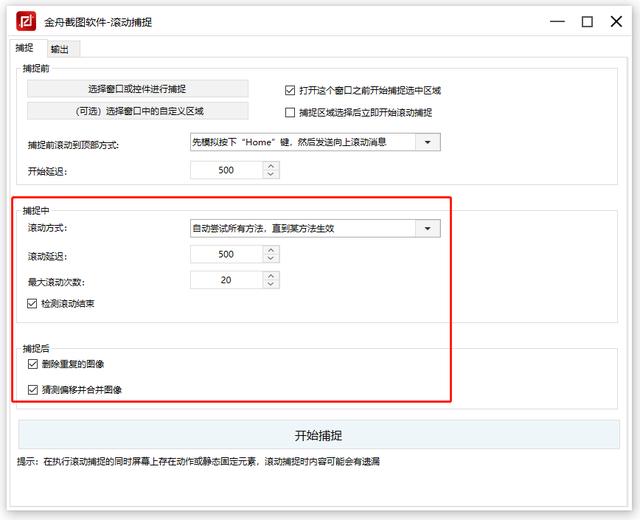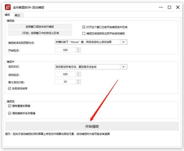 回到软件,继续进行设置,你可以根据实际情况来选择滚动方式以及捕捉后的动作,