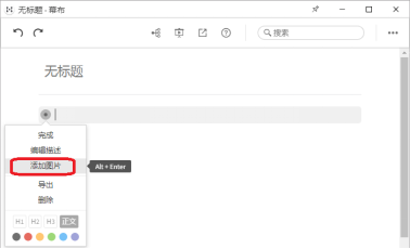2、进入文档界面,将鼠标放置在标题前圆点上,在出现的下拉菜单中选择【添加图片】;当然,你也可以使用快捷键【Alt+Enter】,