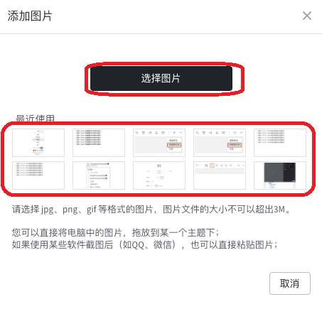 3、弹出添加图片窗口,点击【选择图片】或者直接在最近使用中选择图片。目前幕布支持jpg、png、gif 等多种格式的图片添加。
