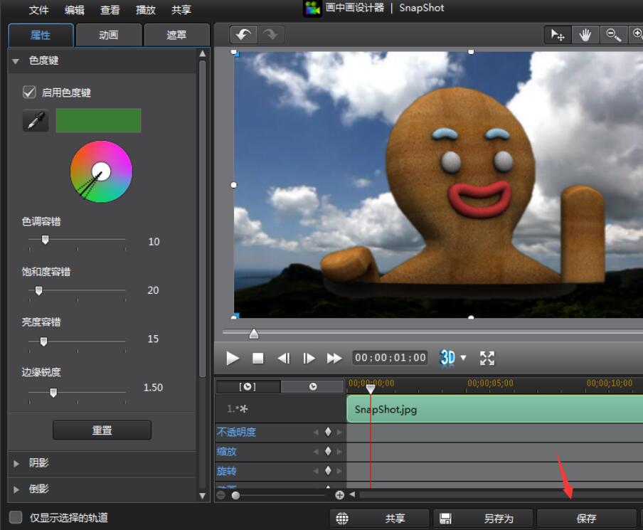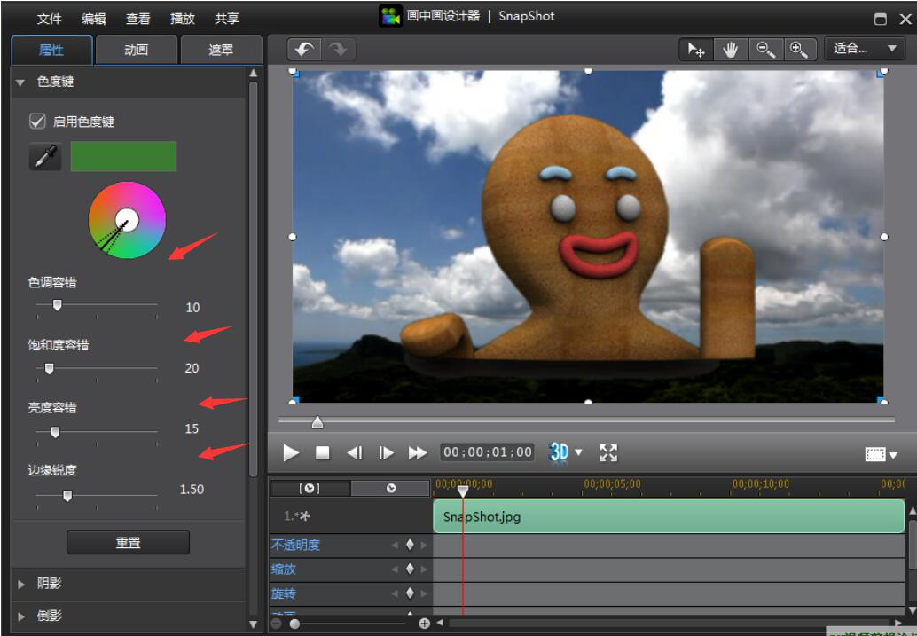 5、此时,用户就可以威力导演已经换了视频背景。但为了让效果更逼真自然,我们一般还会调整色调容错、饱和度、亮度、边缘锐度。