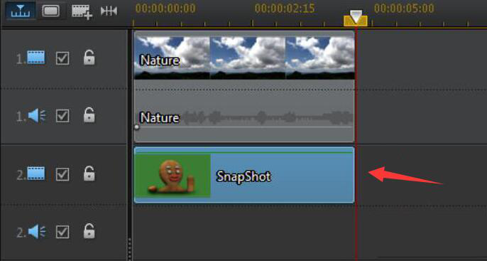 3、接下来,将该视频拖放到威力导演的编辑区域。在动画轨道1处放置新背景,在动画轨道2处放置原来的视频背景,例如,这里要将绿色背景换成天空背景。双击绿色背景的视频片段。