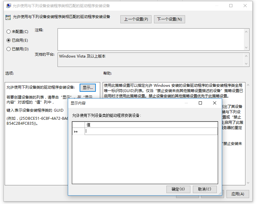 现在找到并双击【允许使用与下列设备安装程序类相匹配的驱动程序安装设备】,弹出窗口,勾选【已启用】,点击下方【显示】,弹出面板,输入之前复制的硬件ID数值,依次点击确定。