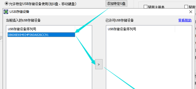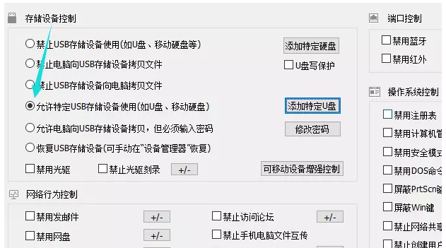 成功登录软件,如图,点击左上方的【存储设备控制】选项,勾选【允许特定USB存储设备使用】,然后点击【添加特定U盘】,弹出窗口,在左侧选中插入U盘或者硬盘的设备序列号,点击中间的符号,最后点击保存。