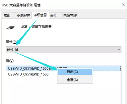 进入属性面板,点击切换【详细信息】选项,如图,点击【属性】——【硬件ID】,复制数值,