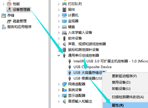 先将U盘插入电脑,鼠标右击桌面上的【计算机/此电脑】图标,选择【管理】,进入计算机管理窗口;如图,在左侧点击【设备管理器】,然后在右侧点击展开【通用串行总线控制器】栏目,右击【USB大容量存储设备】,选择【属性】,