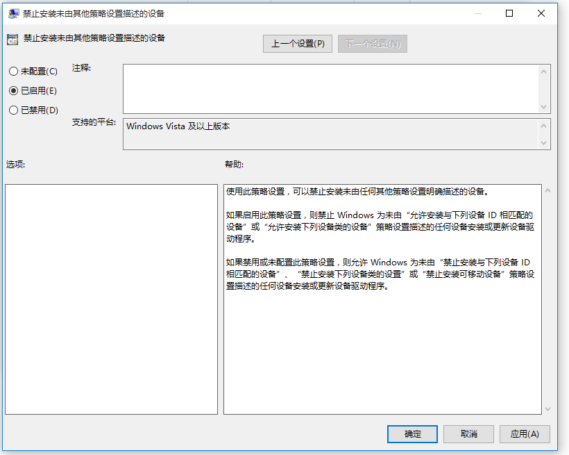 在窗口右侧找到并双击【禁止安装未由其他策略设置描述的设备】,弹出新的窗口,勾选【已启用】,点击确定。