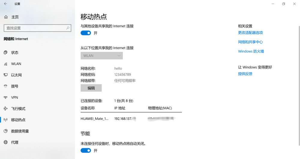 如图,移动热点功能默认是关闭的,现在将其打开,即可实现与其他设备共享Internet连接,