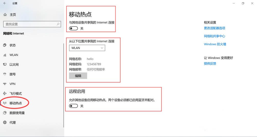 注意:如果你的笔记本电脑中没有“移动热点”选项,建议更新Windows系统;当然了,如果笔记本电脑中没有无线网卡,则无法开启热点,建议配置一块无线网卡。