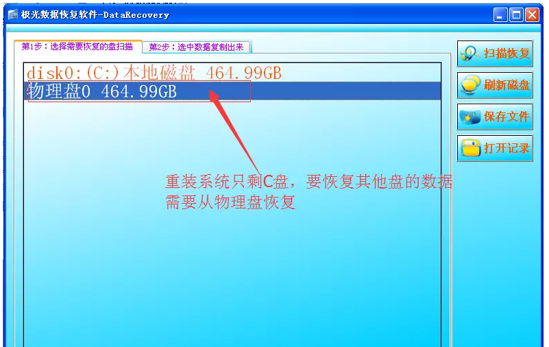 打开软件,进入界面,这里会列出分区和物理盘,由于分区丢失,用户需要从物理盘恢复数据,