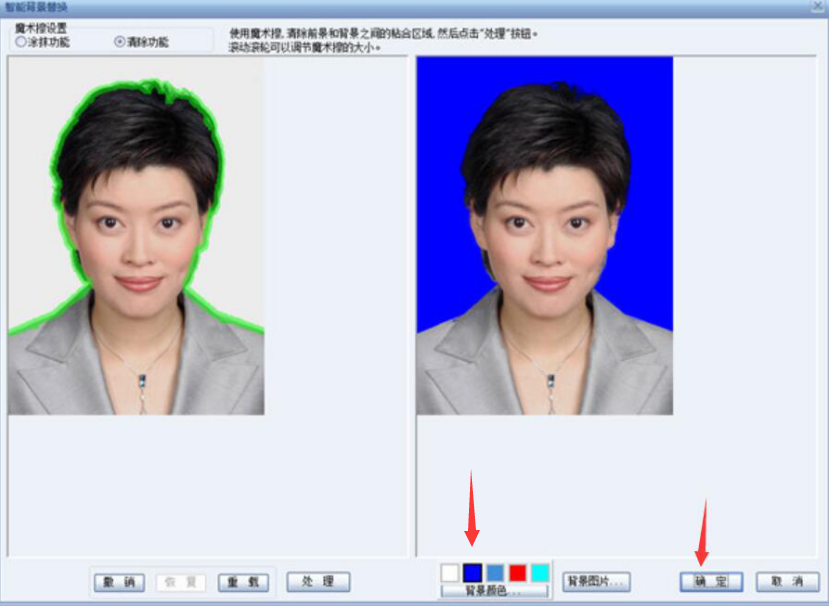 6、随后,进入证照之星的“智能背景替换”操作页。用户可以根据自己的习惯,选择适合自己的魔术擦和证件照规定的颜色来替换背景颜色。如下图,将照片的灰色背景替换成蓝色背景。