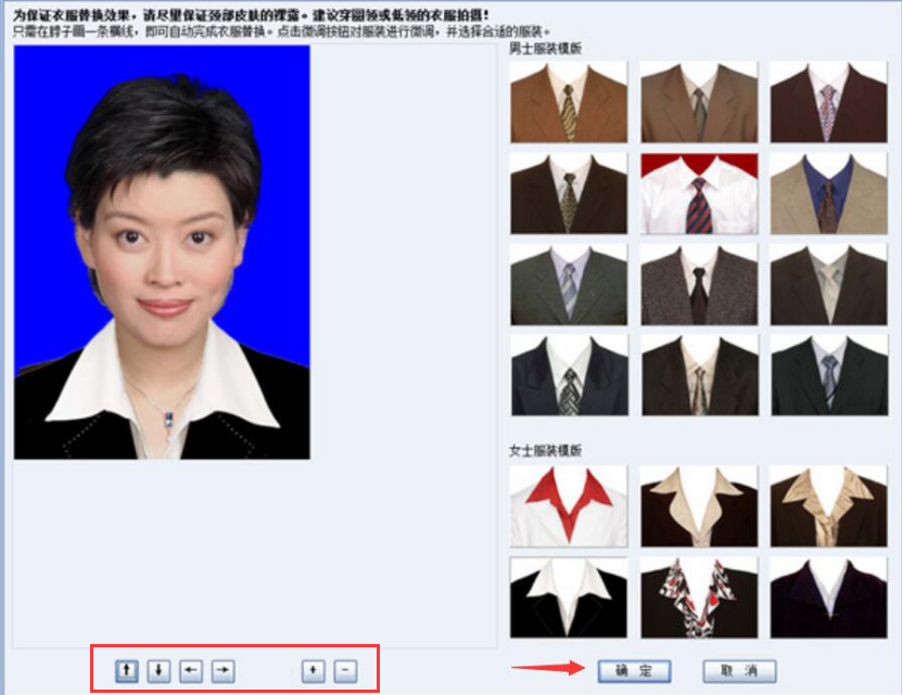 8、在细节调整的菜单中,点选“衣服替换”,用户选择符合自己形象的证件照服装,并通过左侧下方的位置调整按钮来进行细微调整,以达到真实效果后,点击右下方的“确定”按钮。