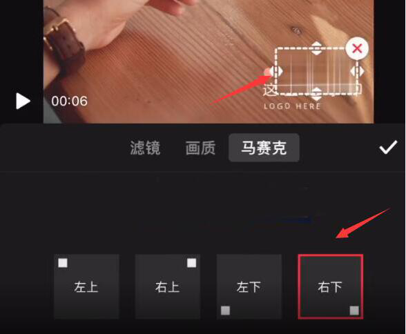 4、因为该视频中,水印是在右下方。所以,这里,点击“右下”的马赛克,可以发现在视频的右下方便会出现马赛克的选区。用户可以通过拉伸选区来调整需要去除视频水印的区域。