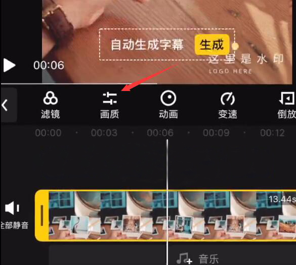 2、然后,在快剪辑中,点选该视频素材并点击其上方功能栏中的“画质”。