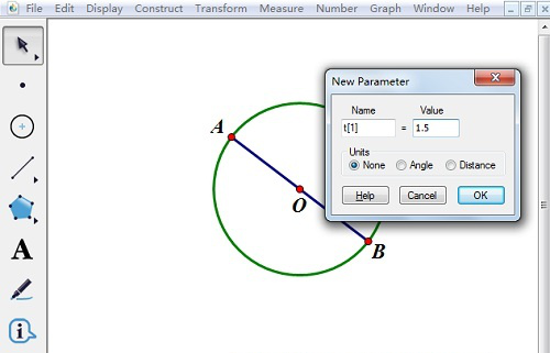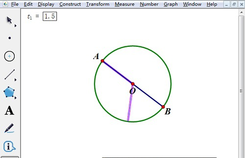 3、在左侧工具栏中选择“自定义工具”(最下面一个),在其下拉菜单中依次选择“角工具”— “n等分角工具”;然后在左侧工具栏选择移动选择工具,依次选中A、O、B三个点,最后点击左上角的参数t1=1.5。得到半个圆被分成了1.5等分如图。