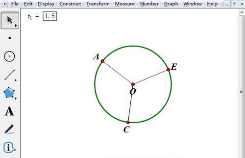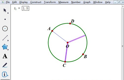 4、隐藏第一次画的直径AB;在第一等分处点上一个点C,然后画一条直径CD,隐藏直径CD:得到C、D两个点;在左侧工具栏中选择“自定义工具”(最下面一个),在其下拉菜单中依次选择“角工具”— “n等分角工具”; 接着在左侧工具栏选择移动选择工具,依次选中C、O、D三个点;最后点击左上角的参数t1=1.5。得到整个圆被分成了3等分。