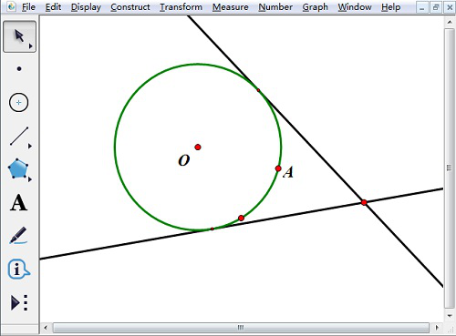 3、使用左侧工具栏中的选择移动工具依次选中圆心O和圆上面的A点,这样圆O外切线就出现了,最后移动鼠标确定圆外的点。