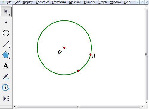 1、打开几何画板软件。选择左侧工具栏中“圆工具”,任取一点O做圆心画一个圆,然后用点工具在圆上任取一点为点A。