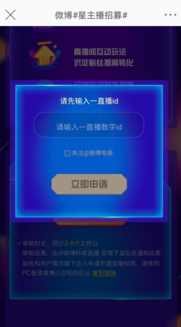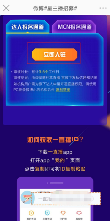 2、新浪微博是与一直播平台进行合作,用户需要注册一直播ID账号。