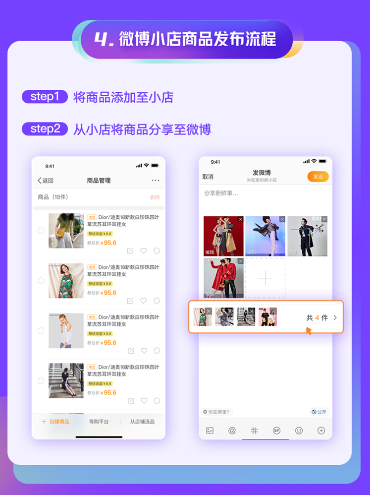 进入微博小店,点击【选品中心】,将商品添加至小店,从小店将商品分享至微博,粉丝和其他用户在信息流内就能点击查看购买商品。