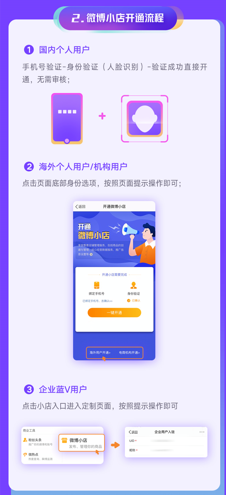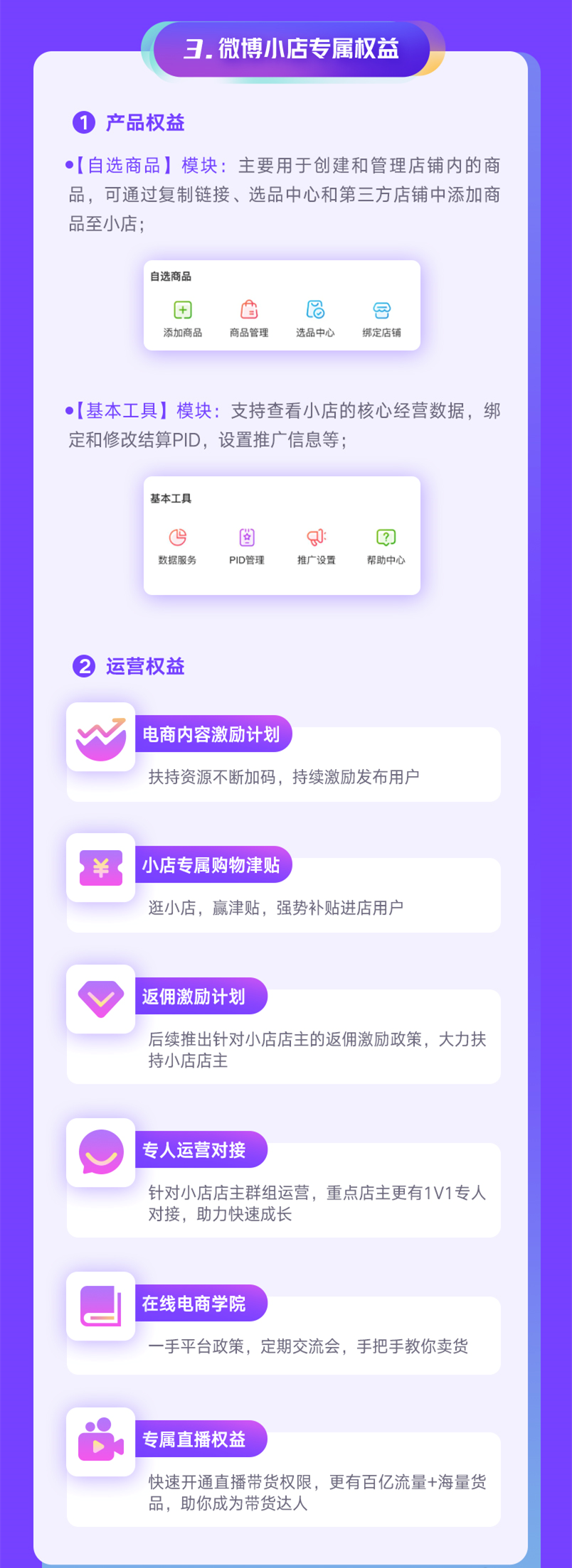 成功开通微博小店,用户可以享有专属权益,分为产品权益和运营权益,例如电商内容激励、小店购物津贴、返佣激励计划等等。