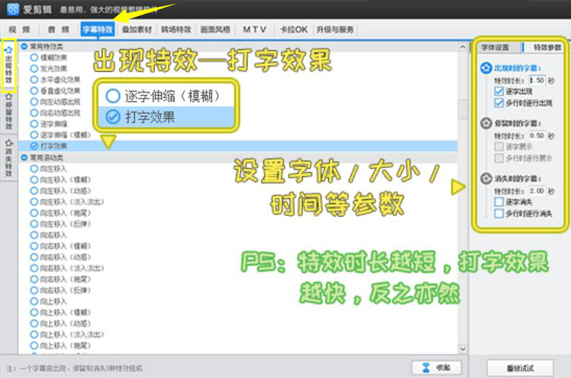 爱剪辑在制作打字机效果的过程中,用户要注意设置的特效时长越长的话,那么制作出来打字机效果显示就会越慢,反之,就越快。