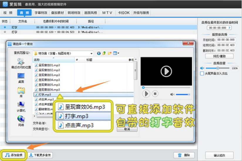 4、最后,为了让打字机效果更为逼真,用户可以点击爱剪辑主界面左下方的“添加音频”按钮,将爱剪辑自带的打字音效添加应用。