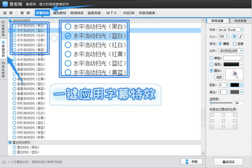 4、字体设置完成,在其左侧,切换至“停留特效”。例如是为了打造酷炫的LED灯感,就选择“水平流动扫光”的字幕特效。