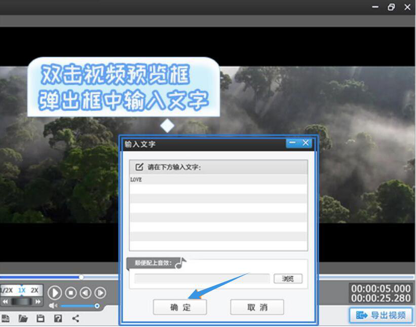 1、首先,用户打开爱剪辑,点击菜单中的“字幕特效”,双击视频预览框,在弹出来的窗口输入需要制作镂空文字效果的文本内容,点击“确定”按钮。