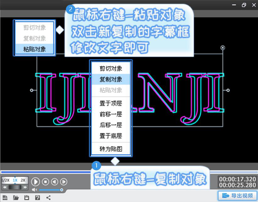 2、然后,在视频预览框中,单击选中已经添加的字体。并右键单击该字体,复制粘贴同样的字体。