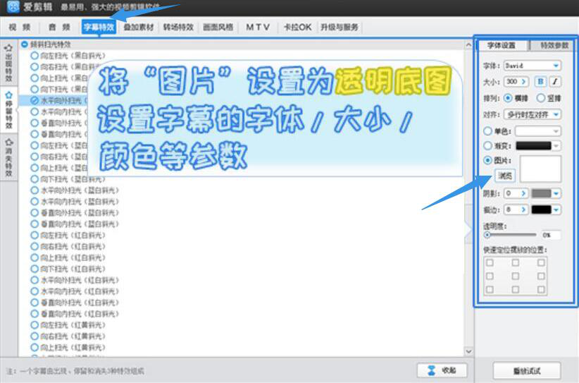 3、为了制作镂空文字效果。用户需要点击爱剪辑菜单栏中的“字幕特效”,在右侧字体设置处,设置字体类型、大小、排列及对齐方式、颜色、透明度、设置图片的底图为透明,还可根据需要设置字幕的阴影和描边效果。