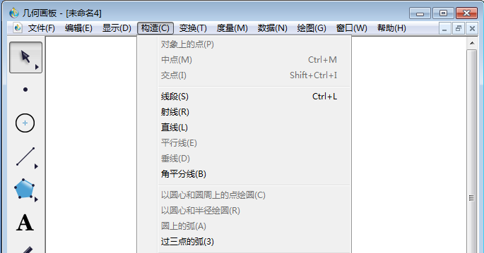 3、使用左侧工具栏【移动箭头工具】,依次选择点A、B、C(注意顺序),然后点击上方菜单栏中【构造】,在其下拉菜单中选择【角平分线】。
