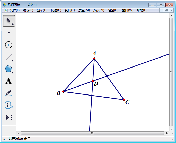 5、相同的方法得到角BAC的角平分线,使用左侧工具栏中【点工具】点出两条角平分线交点(即三角形内心同时也是内切圆圆心),标为 D点。