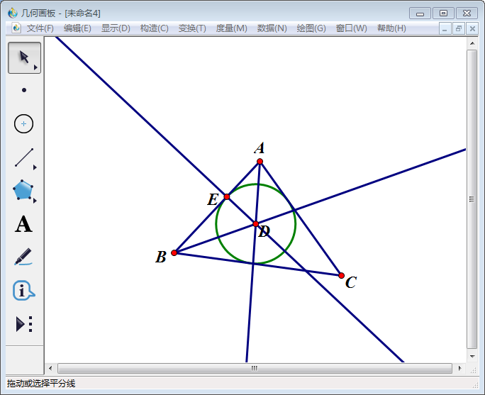 7、使用【移动箭头工具】依次选中点D、E,然后点击【构造】,在其下拉菜单中选择【圆心和圆上的点】,得到三角形内切圆。