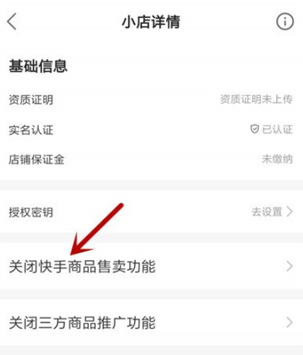 5、查看小店详情,点击【关闭快手商品售卖功能】,