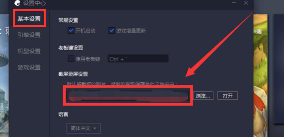 2、然后,想让腾讯手游助手不卡,那就在设置中心里修改相关的设置。先切换至“基本设置”,在其右侧的截屏录屏设置处,将默认的保存路径改为非系统盘,例如改为存放到D盘或E盘。