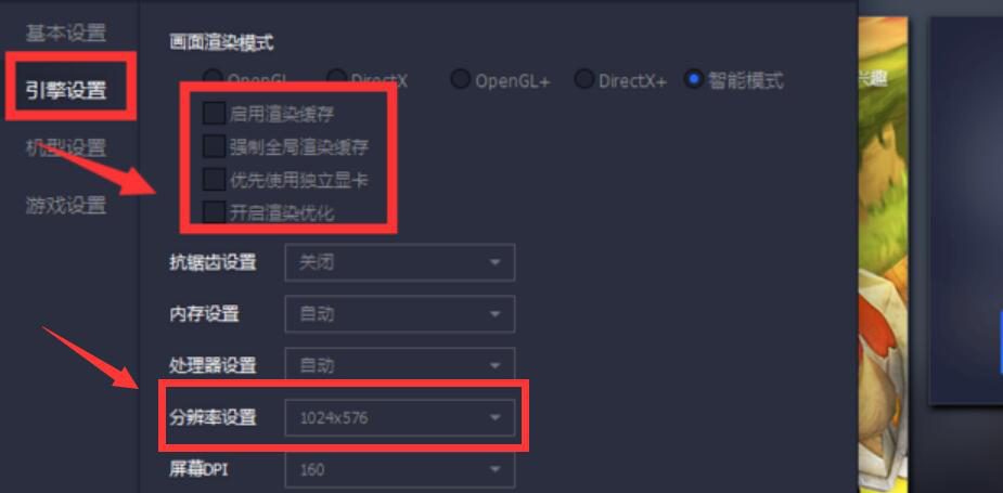 3、接下来,切换至“引擎设置”,在该设置界面中,至勾选自己所需的画面渲染模式,并将分辨率设置低一点,