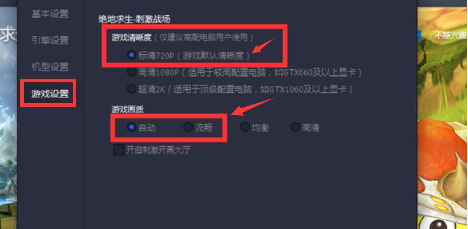 5、最后,要实现腾讯手游助手不卡的目的,还可以切换至“游戏设置”,将游戏的清晰度选择“标清720P(游戏默认清晰度)”和画质设置为“自动”或者“流畅”。