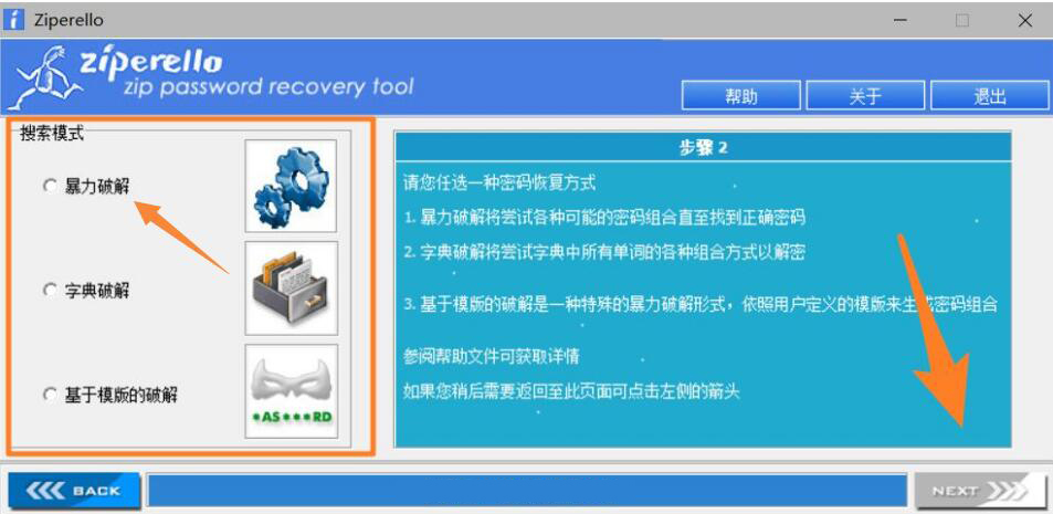 3、此时,用户在Ziperello的界面中可以发现三种zip密码破解的模式,我们一般点选“暴力破解”,因为它适合任何密码组合,还要点击界面右下方的“NEXT”按钮。