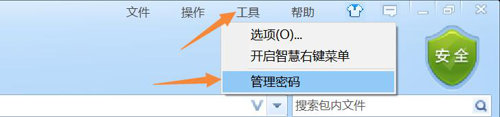 8、zip密码破解并确定正确,用户在该zip文件界面右上方,点击“工具”菜单中的“管理密码”。