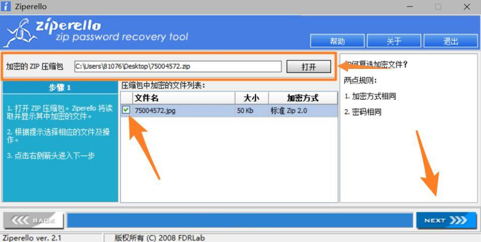 2、然后,用户将需要解除密码的zip导入Ziperello工具。导入后,可能文件的显示是一堆乱码,是正常的。勾选文件名的复选框,点击工具右下方的“NEXT”按钮。