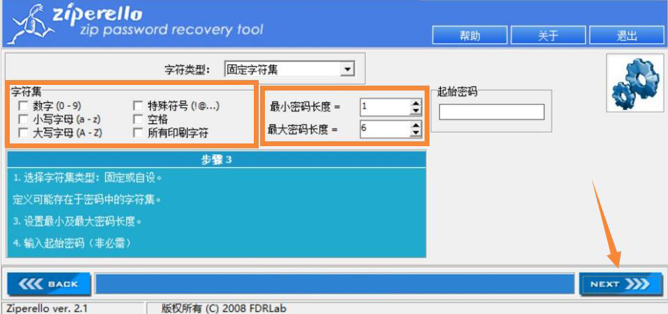4、接下来,在Ziperello的的暴力破解界面中,将字符集的所有项目和设置密码长度,再点击右下方的“NEXT”按钮。