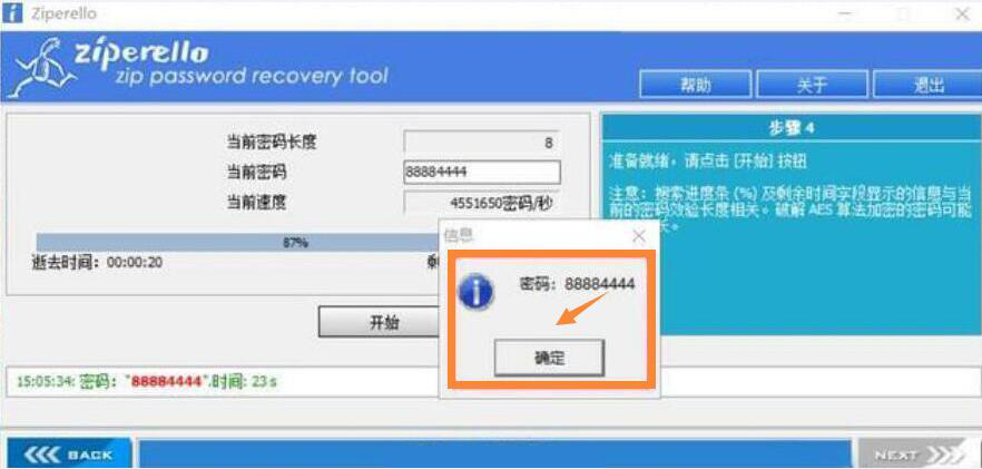 6、耐心等待一会,zip密码便被破解了,用户点击“确定”按钮。