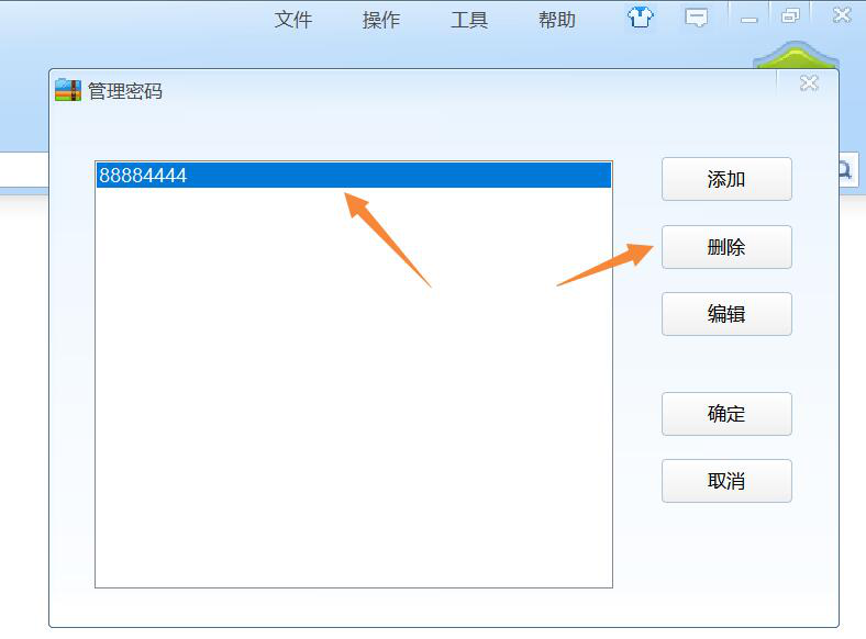 9、最后,在zip的管理密码窗口,单击该密码后,点击右侧的“删除”按钮即可解除zip密码。