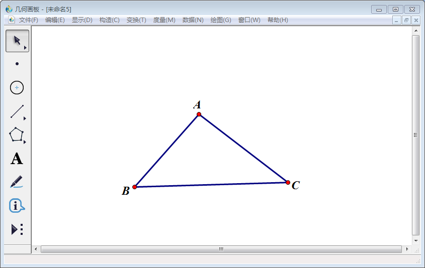 1、打开几何画板软件。点击左侧工具栏中的【线段直尺工具】,任意画一个三角形,使用左侧工具栏中的【文本工具】将三角形顶点分别标记为A、B、C。