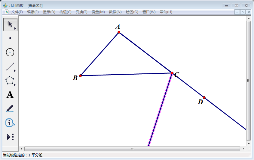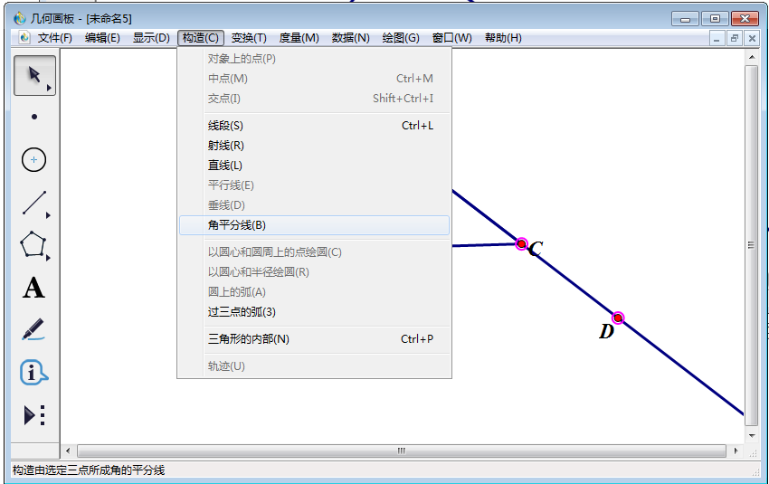 4、使用【移动箭头工具】依次选中点D、C、B,然后点击【构造】,在其下拉菜单中选择【角平分线】。