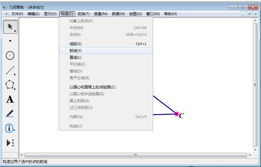 2、点击左侧工具栏中的用【移动箭头工具】依次选中点A、C,然后点击上方菜单栏中的【构造】,在其下拉菜单中选择【射线】,得到射线AC。