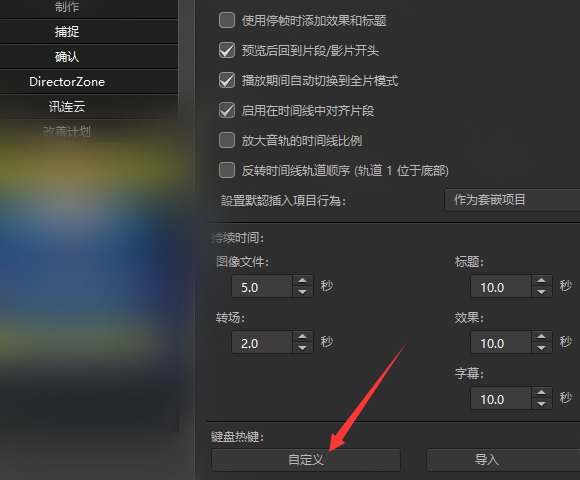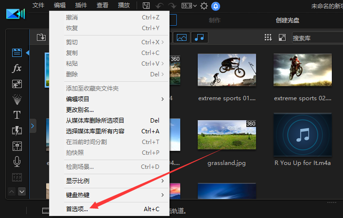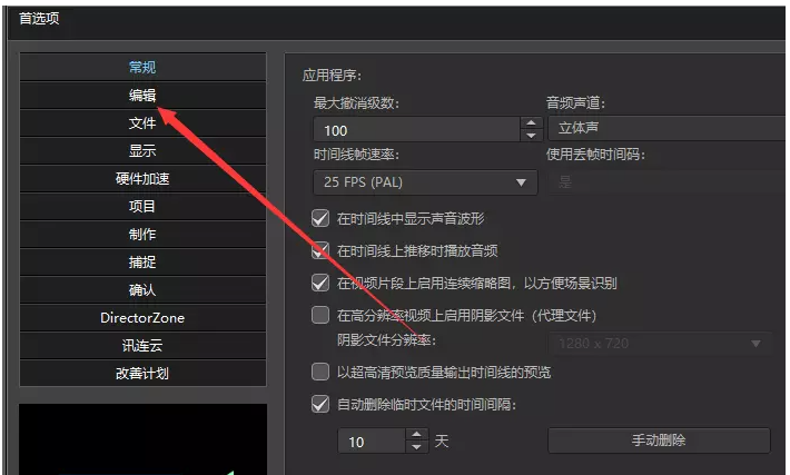 另外,威力导演默认一些快捷键操作,如果你不习惯,可以进行修改。打开软件,点击【编辑】——【首选项】,进入面板,如图,点击【编辑】栏,
